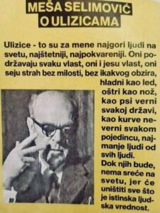 E pa, gospodo ulizice, svojim podaništvom hranite ego onih što ne zaslužuju ni pogled a ne poniznost. Nošeni vašim beskičmenjaštvom bahati predatori će kinjiti mnoge druge, nedužne ljude. Krugovi se šire neslućenom brzinom. Koriste vaše slabosti da bi vas mogli omalovažavati, smejati vam se i otresti vas kao buve sa nogu kad se njima prohte.